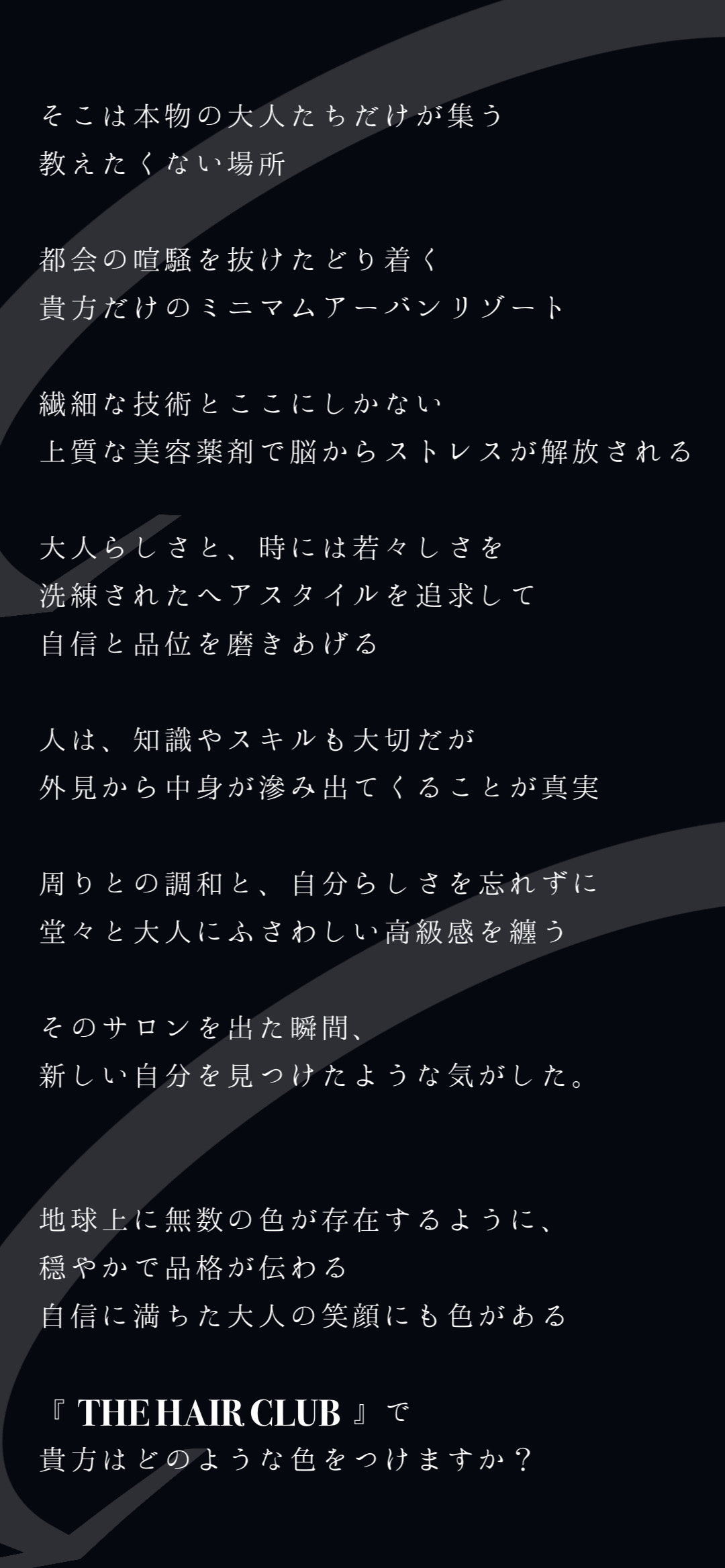 Mr.Hair Club/THE HAIR CLUB会員様はサロンお帰りの際公式LINEのショップカードにて来店チェッカーのご協力をお願いいたします。※サービスの改善その他の目的のため、特典の加除を行うこと等サービス内容・価格を変更する場合がございますので、予めご了承頂きますようお願い致します。