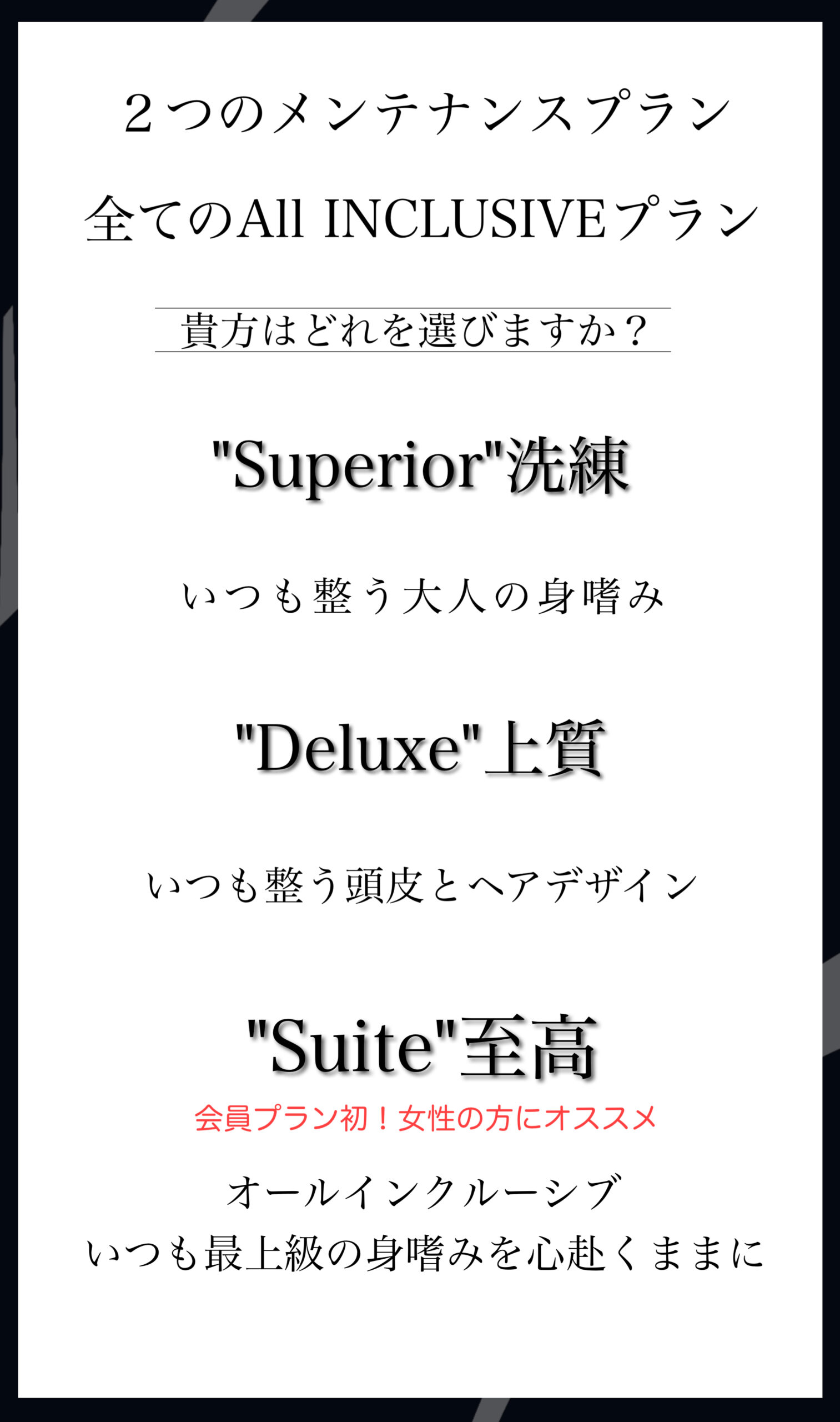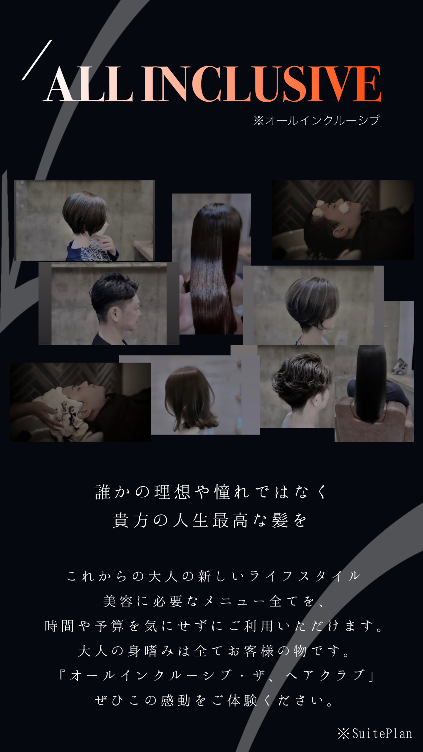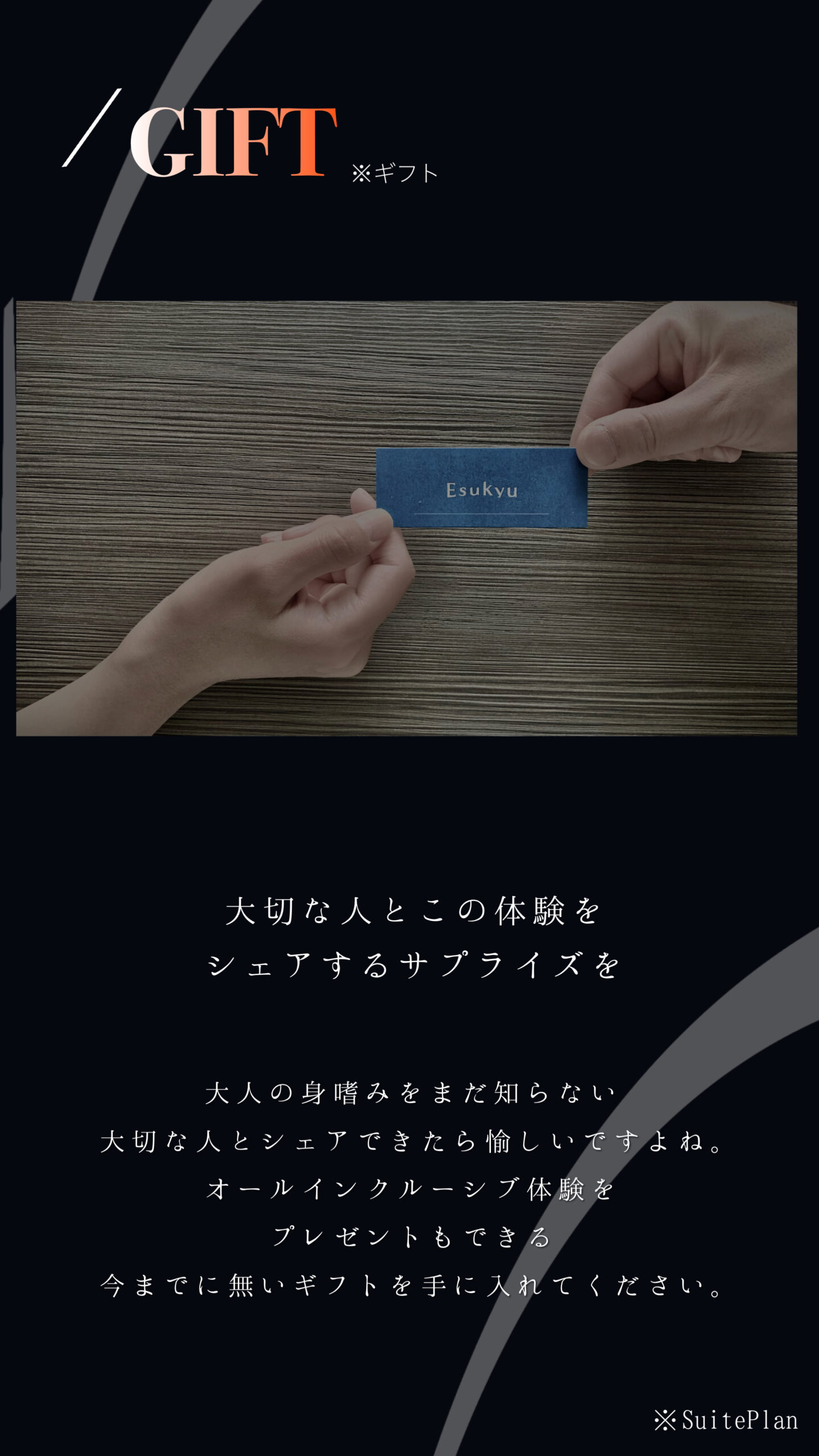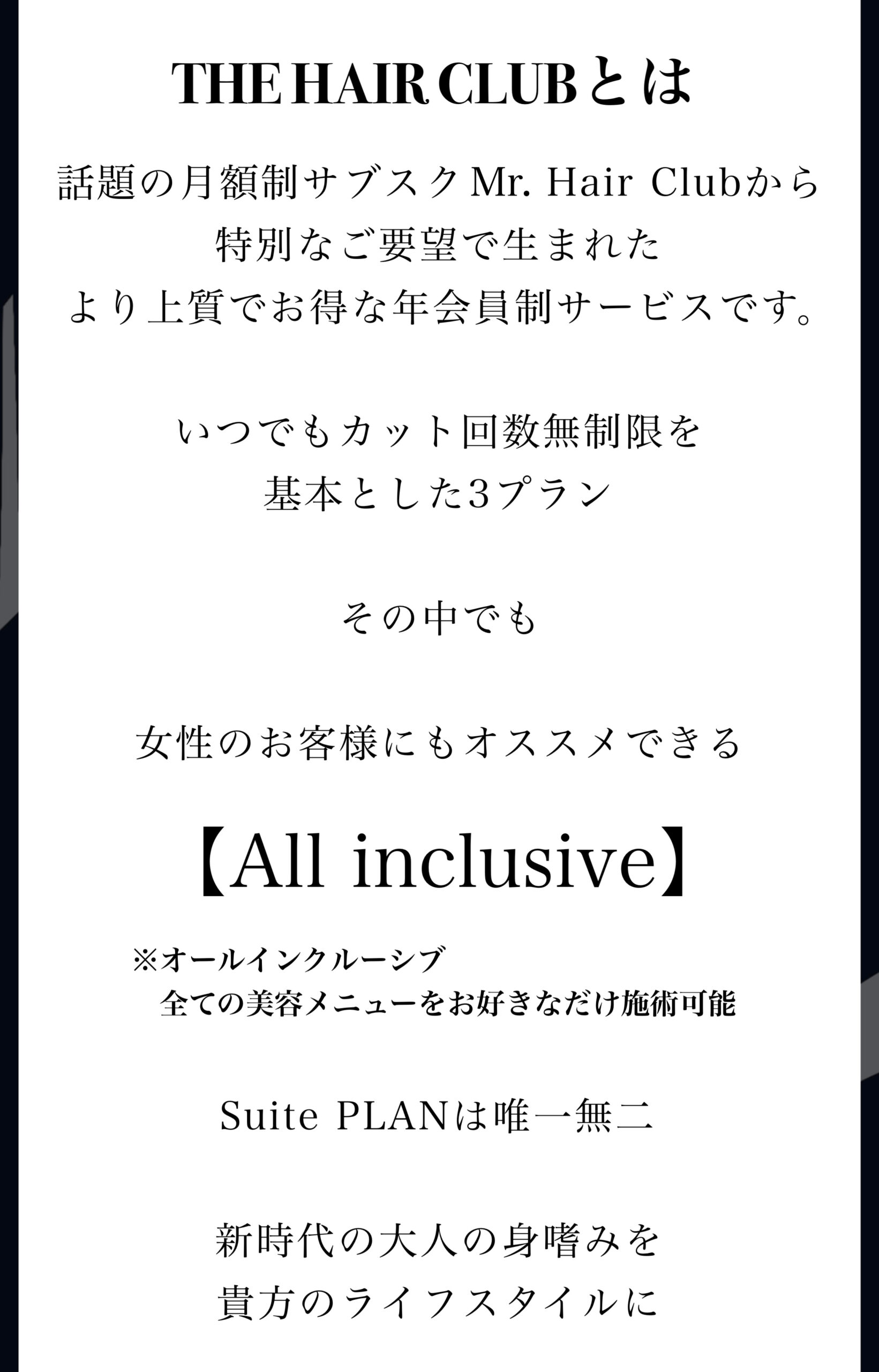 SUITEプランのみの特典・・・会員様のお知り合い様にオールインクルーシブ体験をプレゼントできます。ただこのギフト体験できるお知り合い様は【Esukyu by Hair Salon】に初めてご来店の方のみ及び、ギフト体験回数は1名様1度のみとなります(お知り合い様2度目以降は通常料金、またはMr.Hair Club/THE HAIR CLUBもお申し込み出来ます)